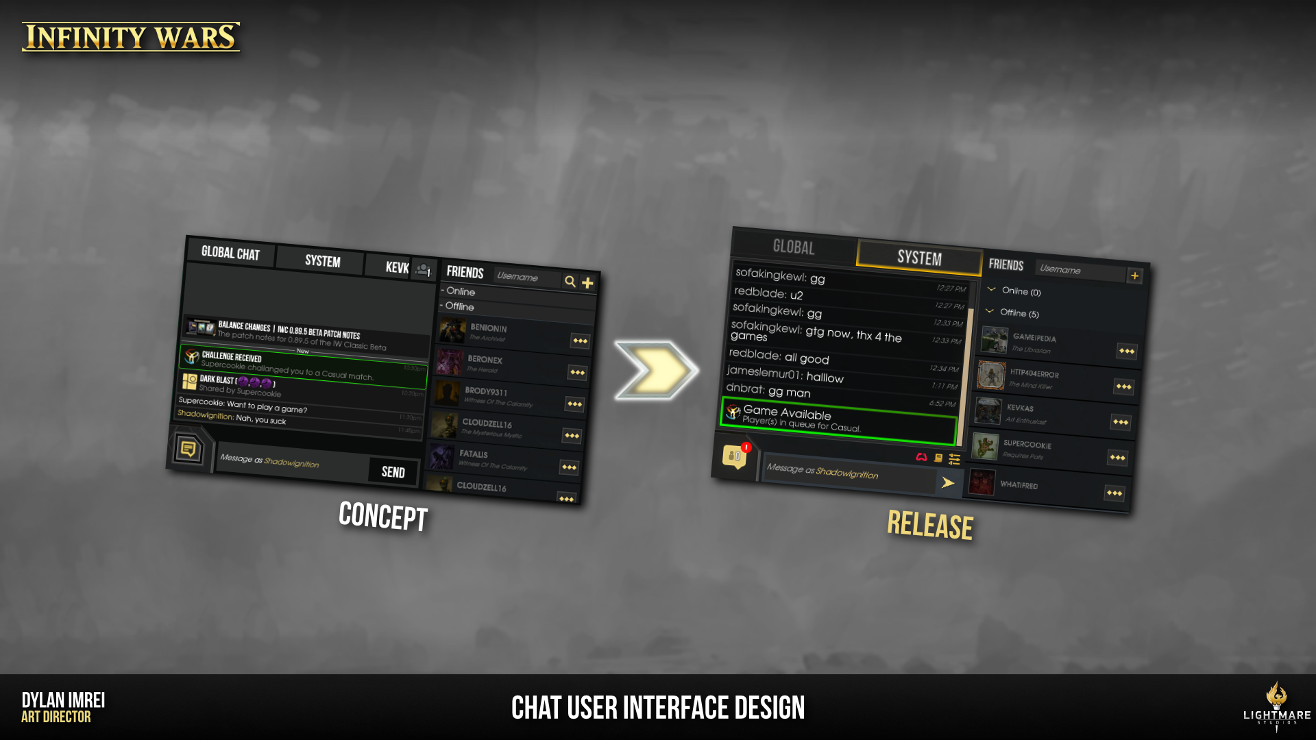 Designed Infinity War's Chat UI, including Chat rooms, friend list, 'Queue Invites' & Deck sharing.